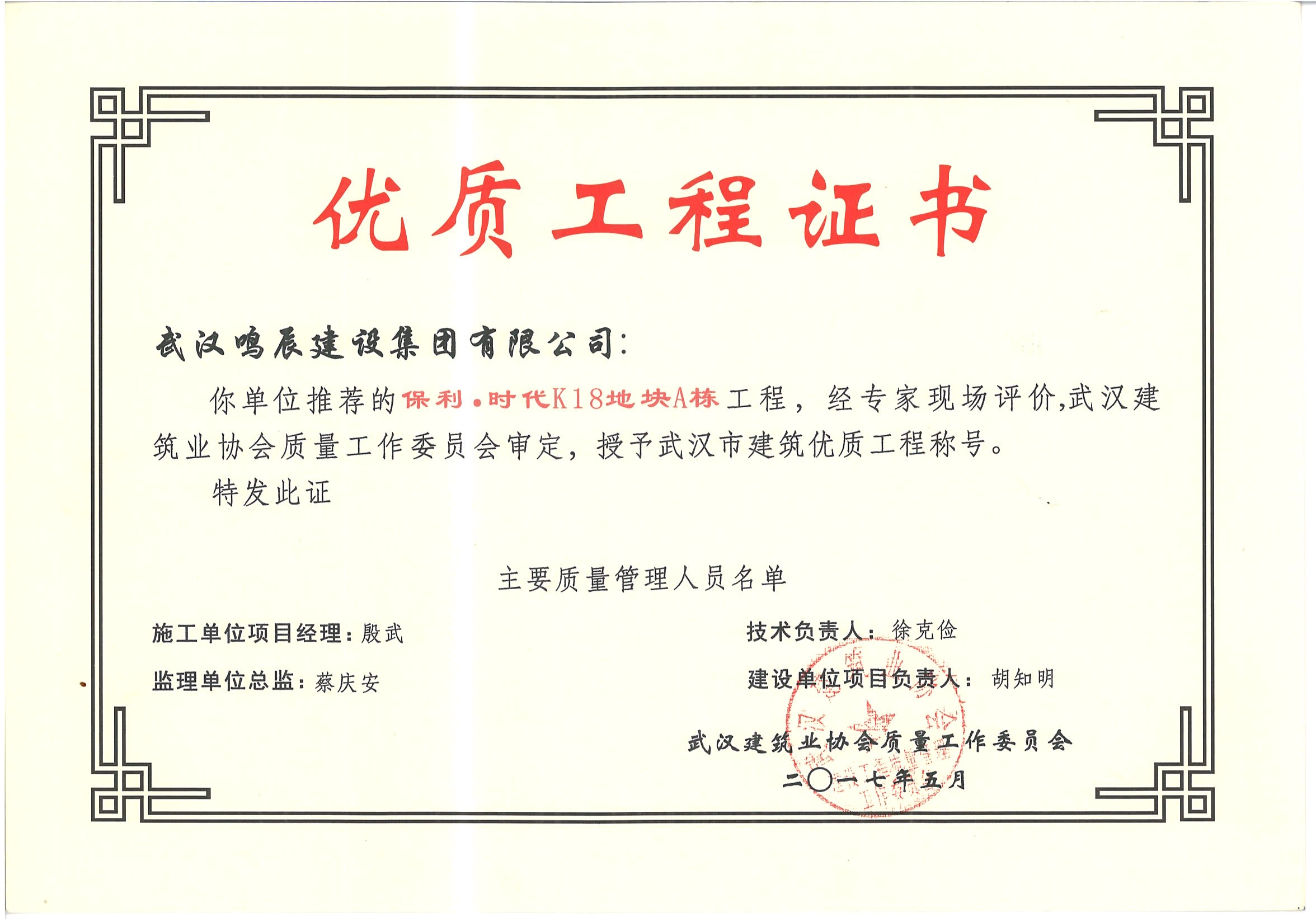 保利時代K18地塊A棟工程榮獲武漢市優(yōu)質工程榮譽