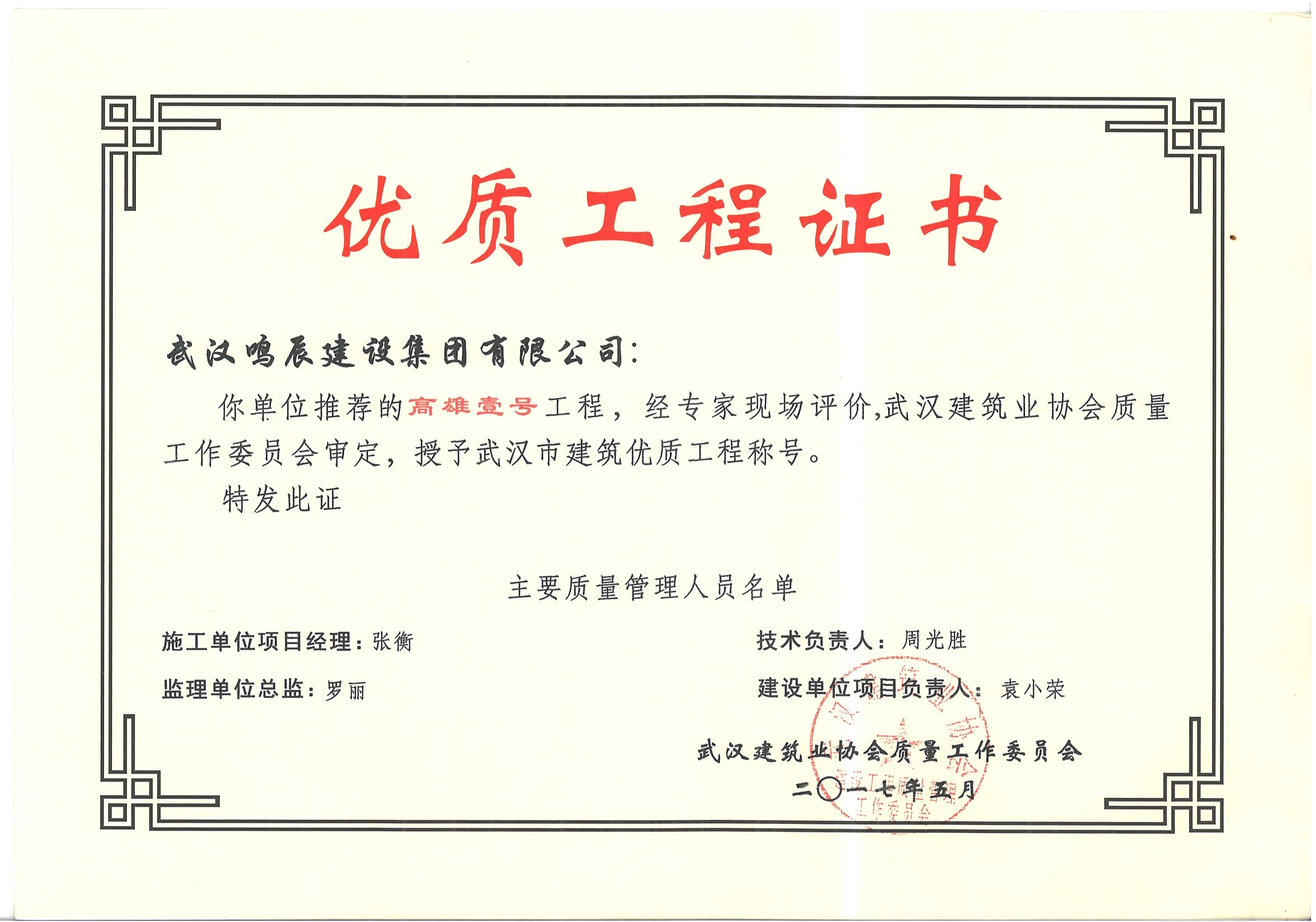 高雄壹號(hào)工程榮獲武漢市優(yōu)質(zhì)工程榮譽(yù)